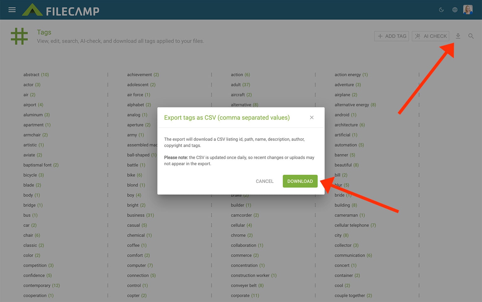 If you want to work with your tags offline in a spreadsheet application such as Microsoft Excel, you can export them as a CSV file. Click on the Download icon to export the current results.