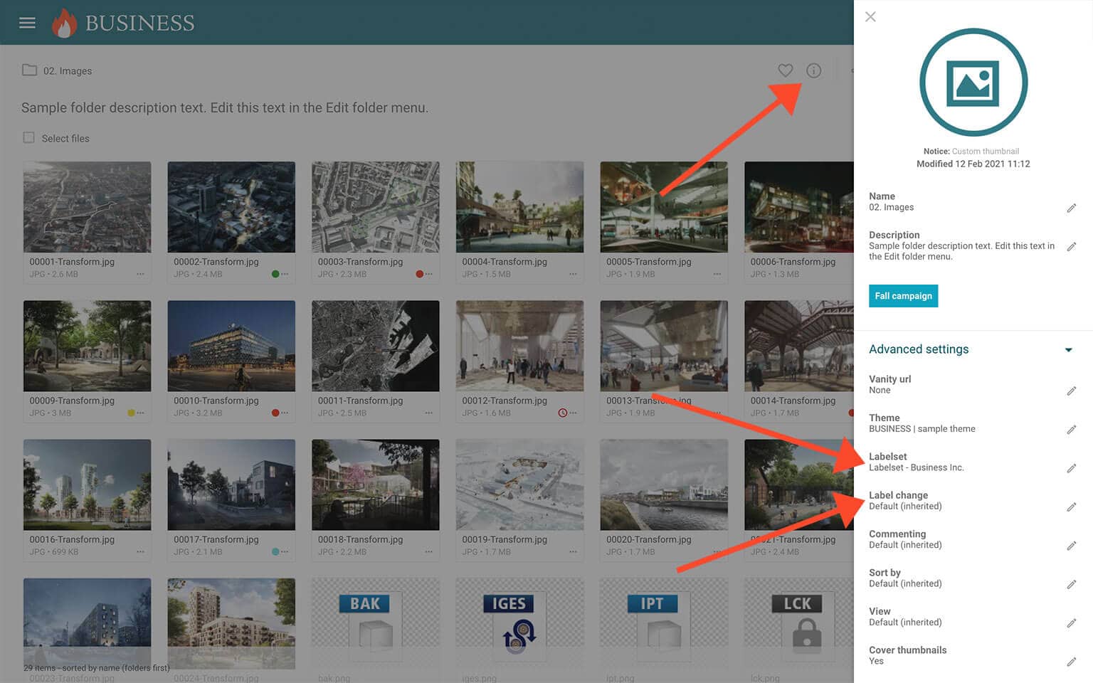 You can always choose another Labelset if you do not want to use the inherited Labelset from a parent folder. To do so just navigate to the folder you want to assign a Label set to, press the Info icon in the Toolbar. Then open the Advanced settings in the Infobar, and select another Labelset from the Labelset drop-down menu.