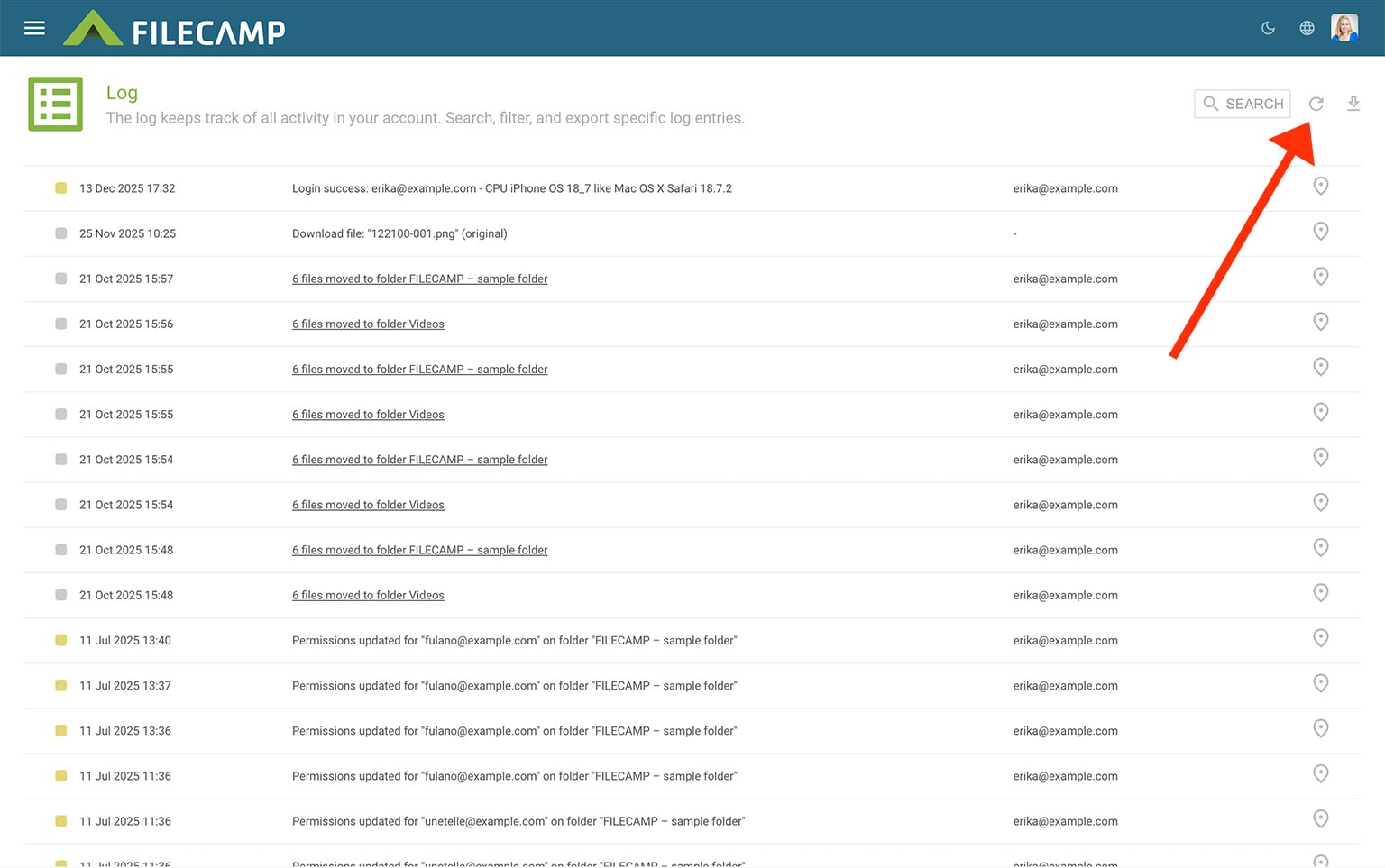 The log is a powerful tool that keeps track of everything that happens in your Filecamp account. You can view, filter, and export activity reports to help keep track of your Filecamp usage.